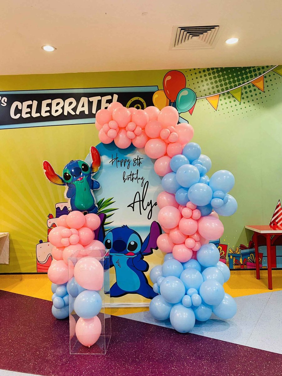 تصميم مرح وملوّن مستوحى من شخصية ستيتش الشهيرة من ديزني! يجمع بين درجات البالونات الزهرية والزرقاء الباستيلية ليمنح أجواءً مليئة بالبهجة والمرح. مثالي لاحتفالات الأطفال الحيوية، كما أضفى لمسة مميزة على عيد ميلاد آلية الثامن.