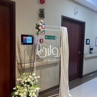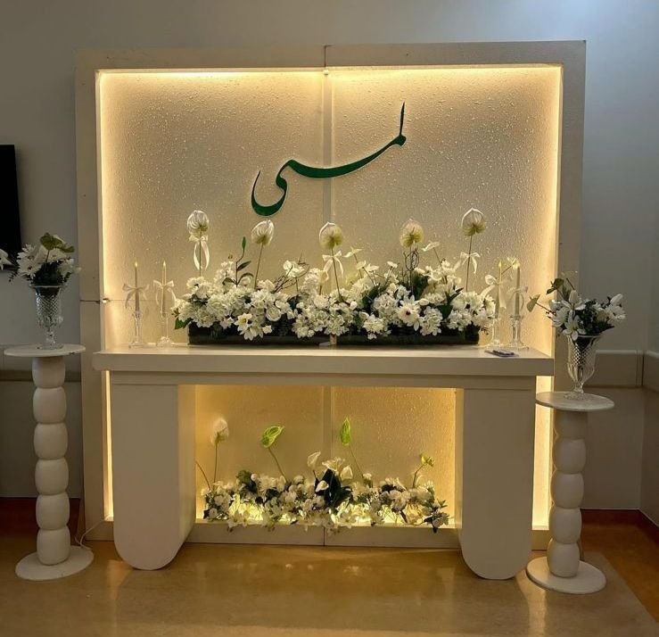 تصميم استقبال مواليد باللون الأبيض مع لمسات خضراء وإضاءة ناعمة تعطي إحساس بالفخامة والهدوء. مثالي لاستقبال المولود بالمستشفى أو بالبيت بأجواء راقية وناعمة تجمع بين البساطة والجمال الطبيعي.