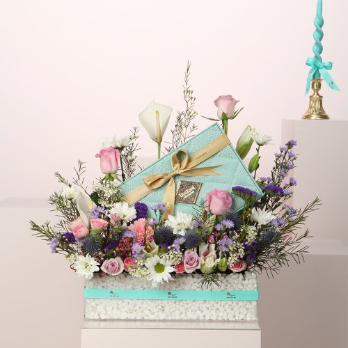 تنسيق زهري فاخر يضم ورودًا باستيلية وزهورًا موسمية مع علبة هدايا أنيقة. مناسب للمناسبات والاحتفالات وتقديم الهدايا المميزة. مزيج راقٍ يجمع الجمال والرقي في هدية واحدة.
