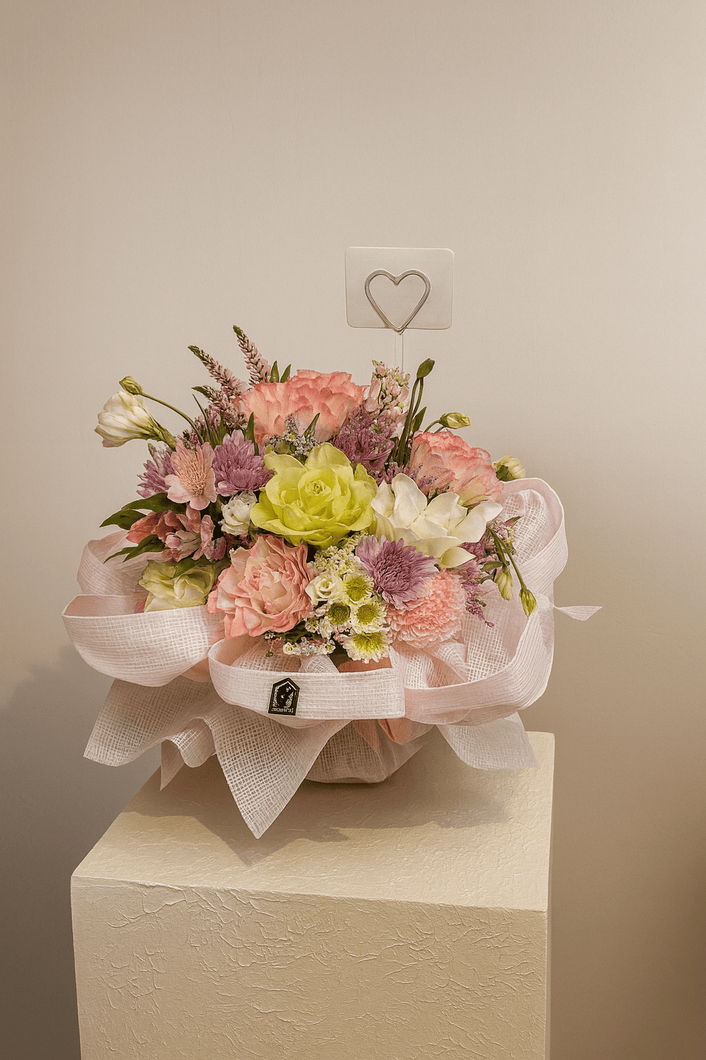 باقة مبهجة من الورود الملونة تجمع بين الوردي والأصفر والبنفسجي، تعكس الفرح والدفء في كل تفاصيلها.