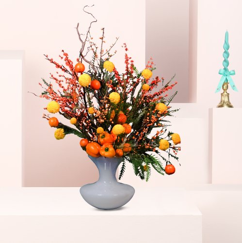 فازة ورد البرتقال المكونه من ١٠ زهرات كراسبيديا صفراء،لمسه البرتقال، قطع الفلفل الرومي، و اكسسوارات طبيعية.