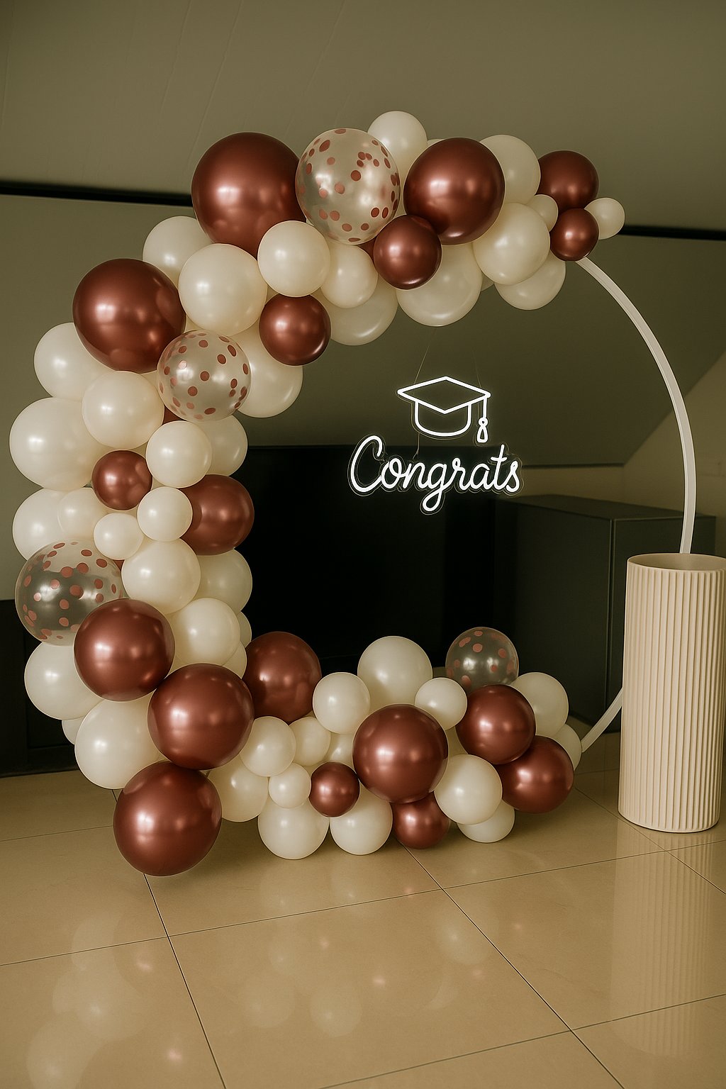 تنسيق أنيق لحفل التخرج يتميز بقوس بالونات دائري بألوان هادئة وفاخرة. ديكور تخرج مثالي لحفل التخرج وخلفية تصوير التخرج، ويضيف لمسة راقية لاحتفال التخرج ويجعل المناسبة مميزة ولا تُنسى.