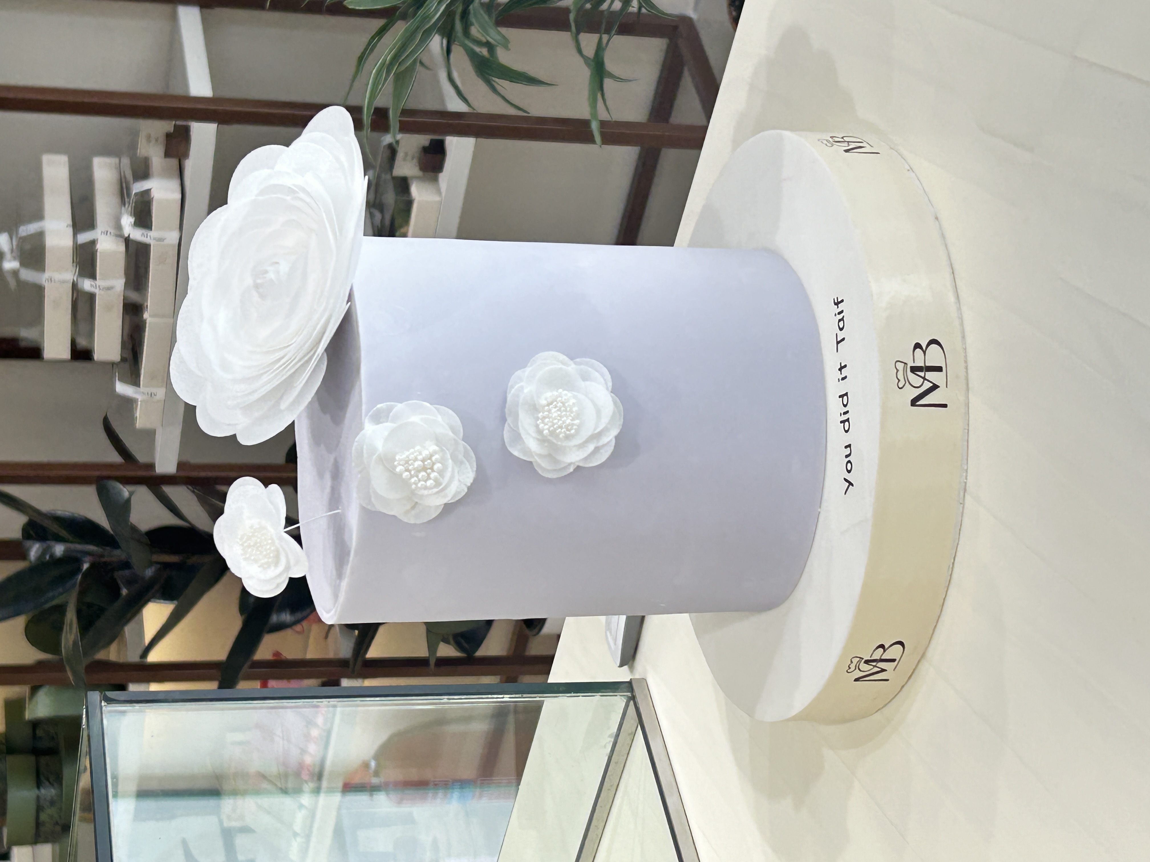 كيكة تخرج أنيقة بلون هادئ، مزينة بورود بيضاء ناعمة بتفاصيل لؤلؤية مبهرة، وقاعدة تحمل عبارة "You did it ". مثالية للاحتفال بنجاح راقٍ.