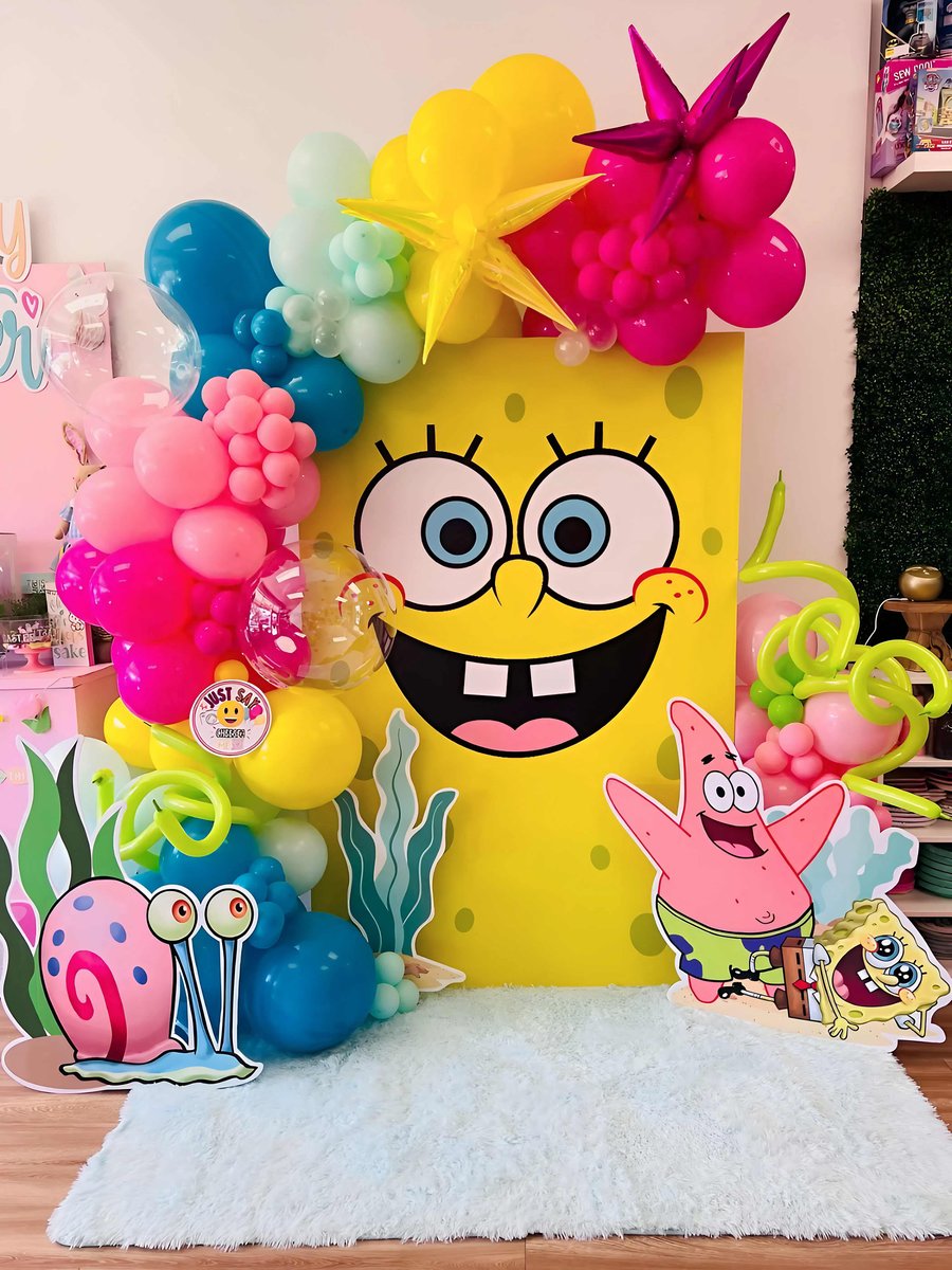 تنسيق عيد ميلاد مستوحى من سبونج بوب بألوان زاهية وديكور بالونات مرح وخلفية كرتونية جذابة. مثالي لحفلات أعياد ميلاد الأطفال، حيث يضيف أجواء ممتعة ومرحة لاحتفال عيد الميلاد ويجعل ديكور عيد الميلاد مليئًا بالحيوية ولحظات تصوير لا تُنسى.