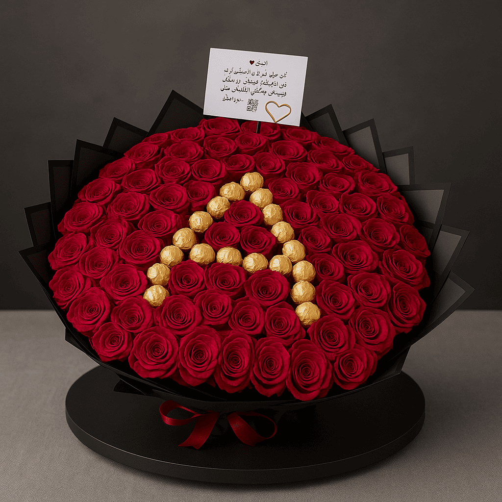 باقة فاخرة من الورد الأحمر بتنسيق دائري، تتوسطها شوكولاتة ذهبية تشكل حرف