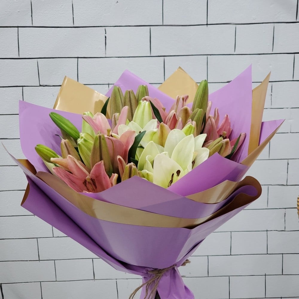 باقة تضم 8 أغصان من أزهار الليليوم الفاخرة، منسقة بتغليف مووف.
