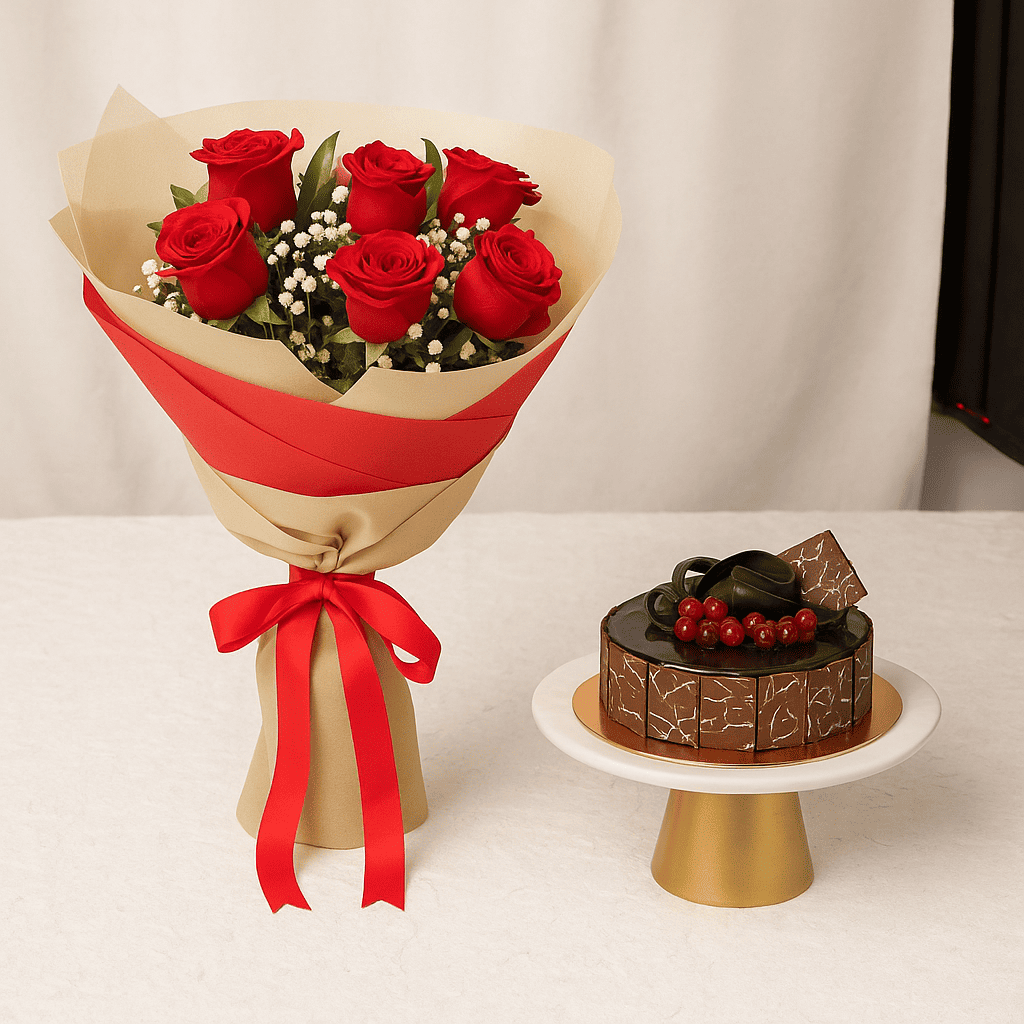 - بوكيه ورد أحمر 6 ورود في غلاف بيج - كيك شوكولاتة مزينة بالتوت - وزن الكيك: نصف كيلو ، حجم الحصص: 4 حصص تكفي 4 - 6 أشخاص"