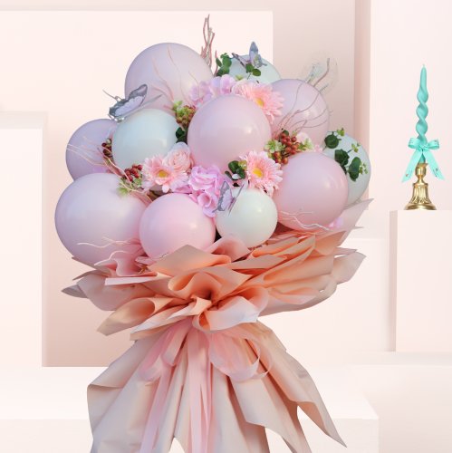 مزيج رائع من البالونات الوردية والبيضاء مع لمسات من الزهور الصناعية المميزة. هذا التنسيق الأنيق والجميل مصمم خصيصًا للاحتفال بمولودتكِ الجديدة. الباقة الكبيرة تضيف لمسة ساحرة من البهجة وتناسب أجواء الفر