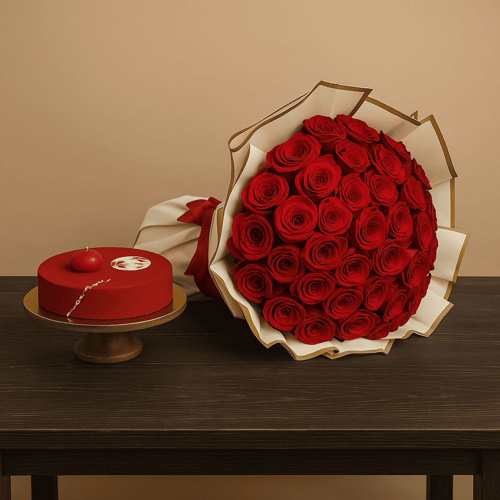 باقة رائعة من الورود الحمراء مع كعكة رد فلفت أنيقة، مثالية للمناسبات الرومانسية والخاصة