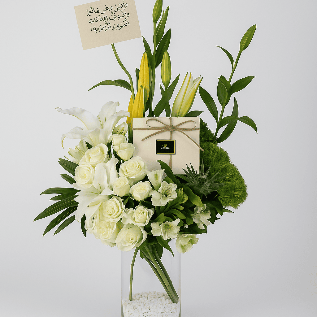 فازة راقية بورد جوري أصفر ونباتات خضراء طبيعية