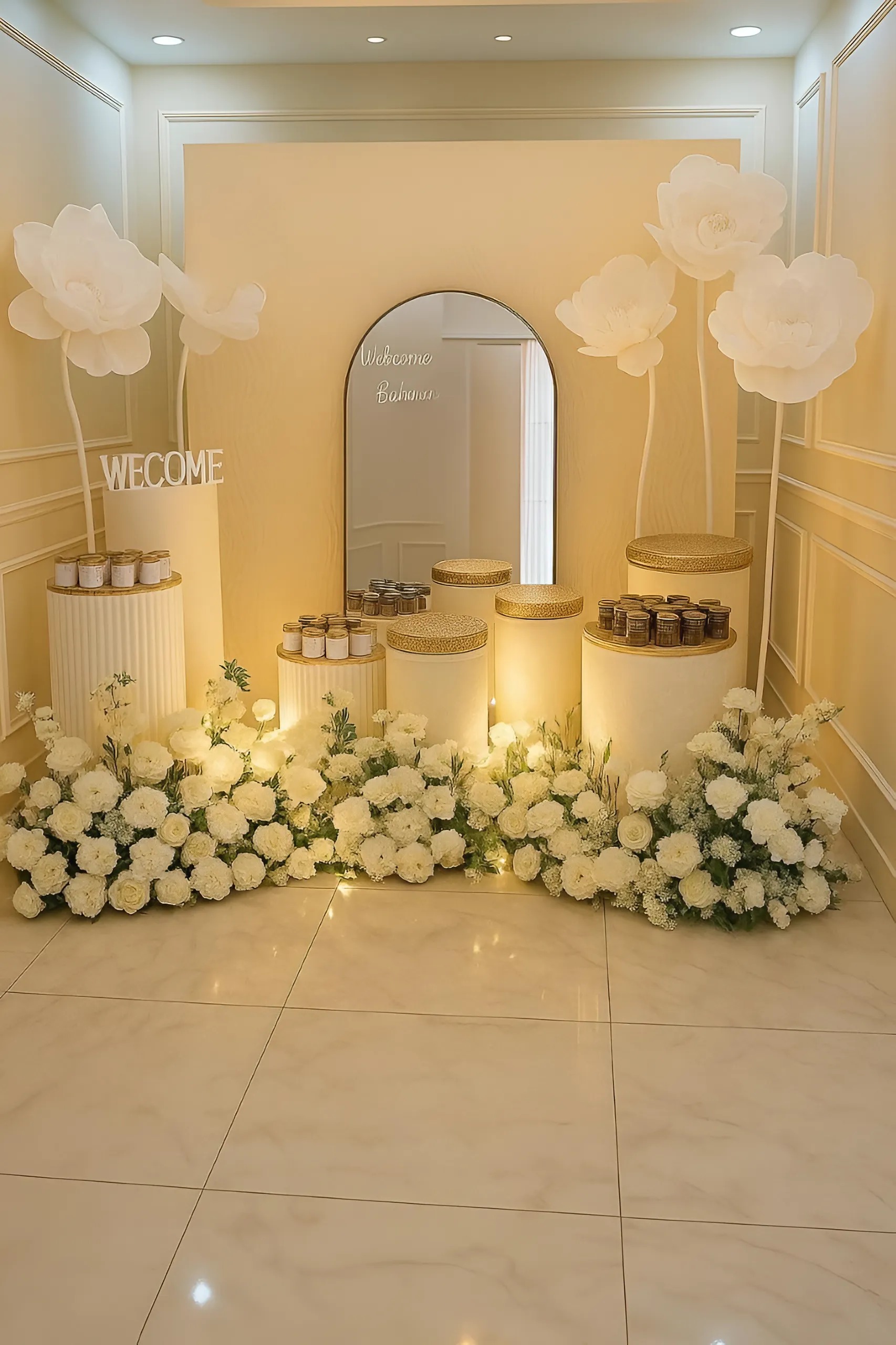 ركن ترحيب أنيق يضيف لمسة فخمة لأي مناسبة. تصميمه بزهور بيضاء واضاءة ناعمة وألوان رايقة يعطي إحساس راقي ومميز. مثالي لحفلات الزواج، الخطوبة أو استقبال الضيوف، ويخلي أول لحظة بالمناسبة مليانة أناقة ودفء.
