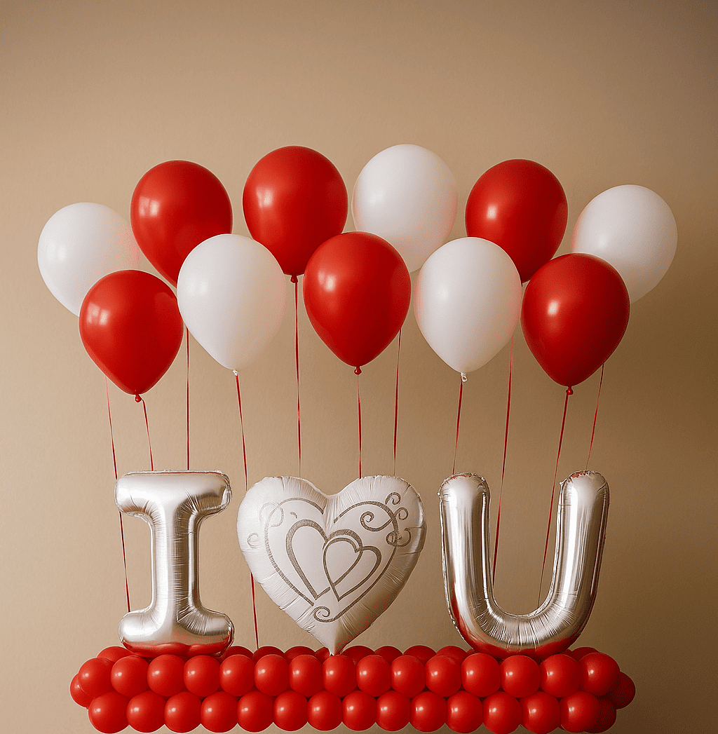 تنسيق رومانسي ببالونات حمراء وبيضاء مع حروف “I ❤️ U”، مثالي للذكرى، والخطوبة، وحفلات الزفاف أو أي مناسبة حب. ديكور بسيط وأنيق يعبر عن المشاعر بطريقة جميلة ولافتة.