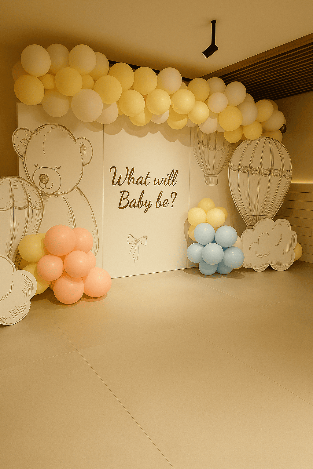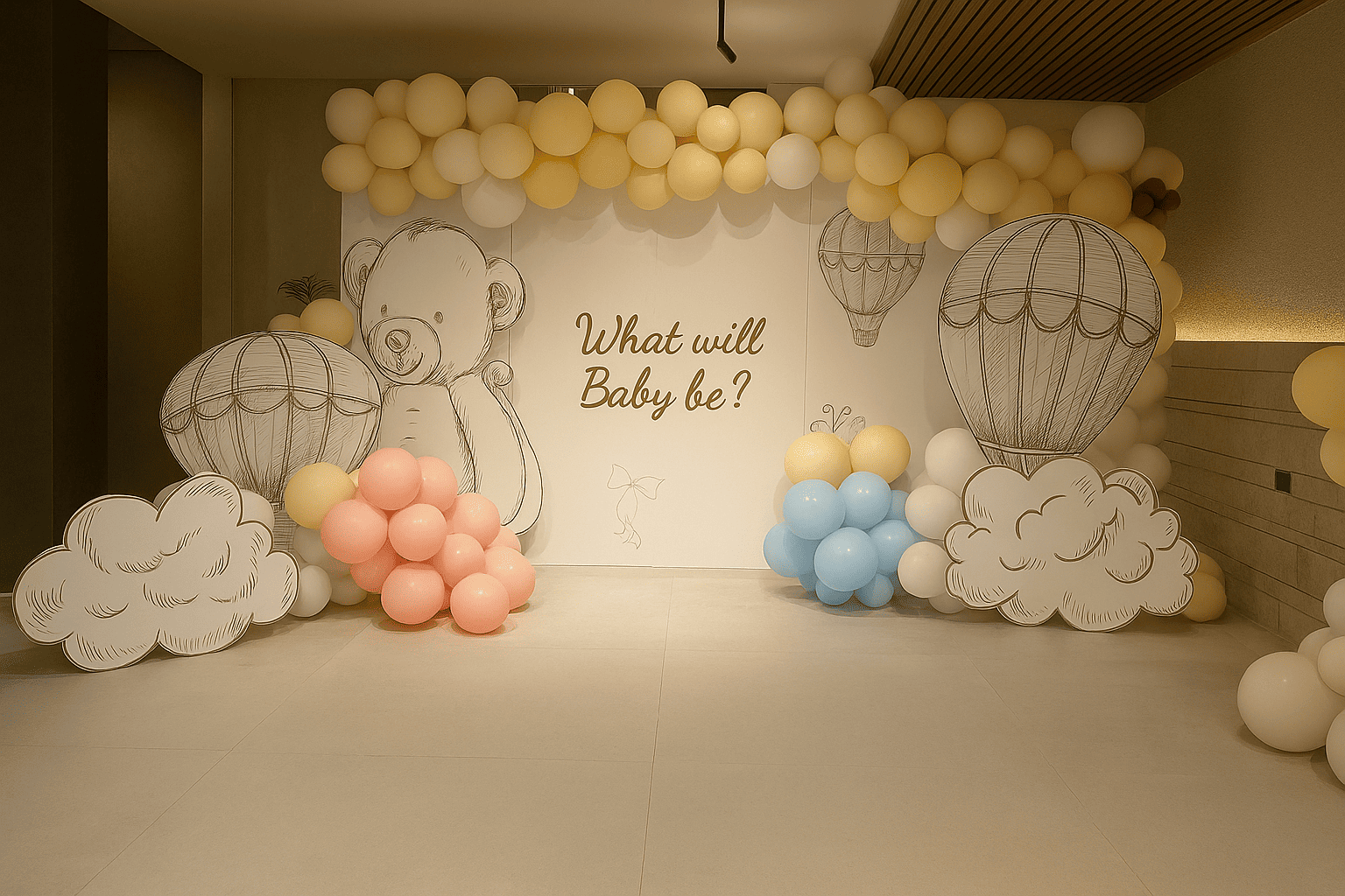 تصميم دافئ وناعم لحفلة الكشف عن المولود بأسلوب تيدي بير ورسمات بالونات هواء حالمة، مع بالونات بألوان باستيل محايدة. مثالي لحفلات بيبي شو أنيقة وهادئة.