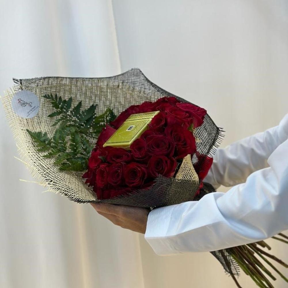 هدية مكونه من الورد الأحمر الجوري مع شكولاته باتشي.