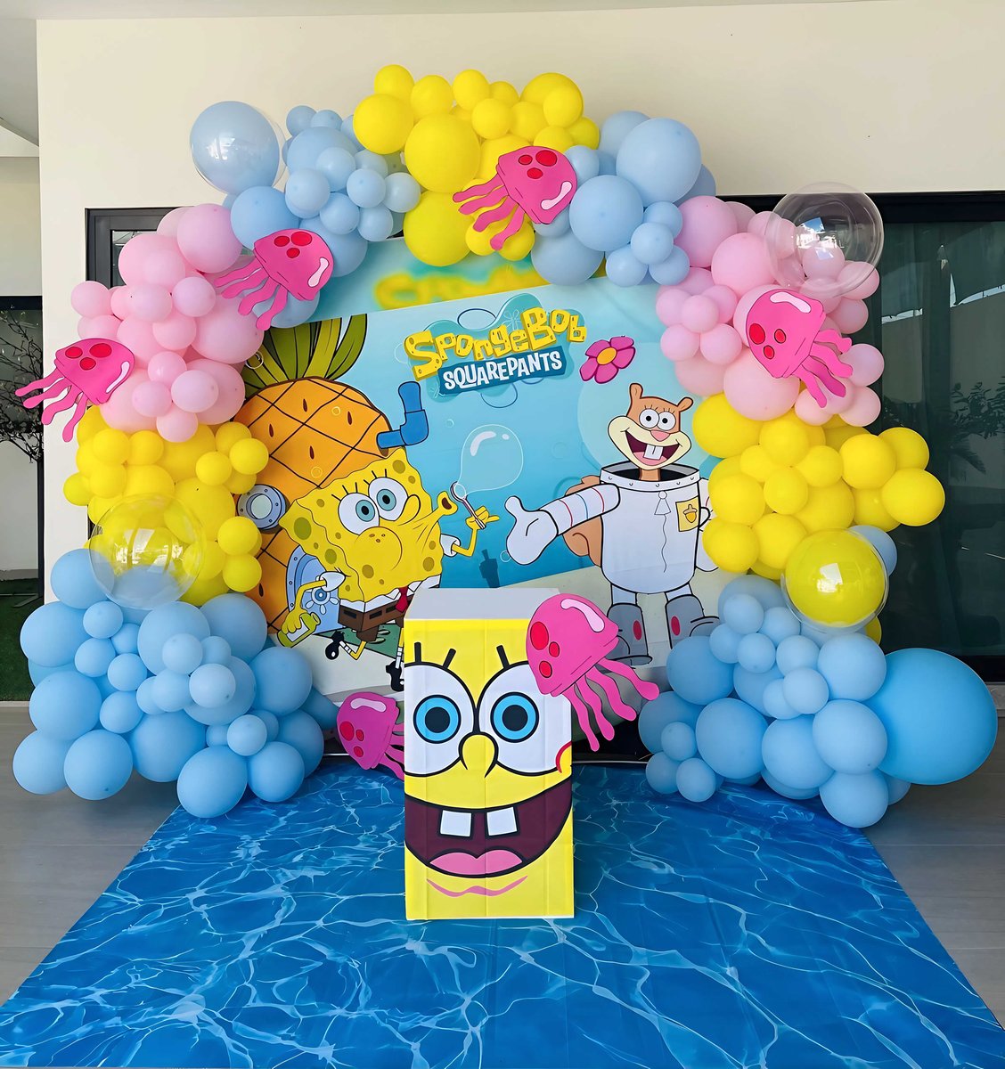 تنسيق حفلة عيد ميلاد مستوحى من عالم سبونج بوب البحري مع بالونات ملونة وتفاصيل قناديل البحر وخلفية كرتونية مبهجة. ديكور مثالي لاحتفال عيد الميلاد وحفلات أعياد ميلاد الأطفال، يضيف أجواء مليئة بالمرح والحيوية ويجعل حفلة عيد الميلاد تجربة لا تُنسى.