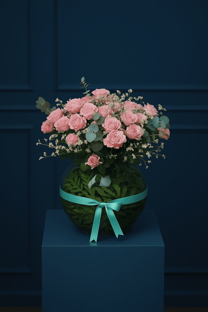 فازة بها١٠ زهرات بيبي روز وردية (كينيا)،٤أوراق لذرليف خضراء (هولندا)،و٤أغصان أكالبتوس (أستراليا)، و٨ زهرات ليمونيوم أبيض (إيطاليا)