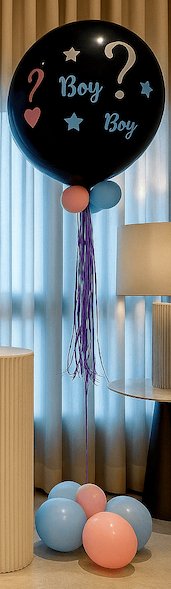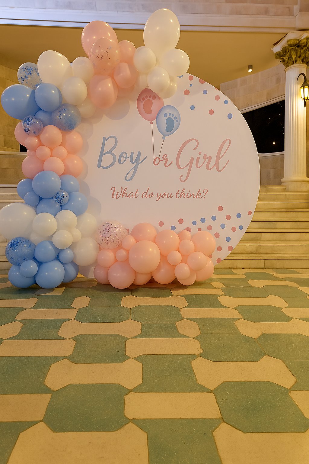 ديكور ناعم لحفلة كشف المولود بتصميم دائري أنيق وبالونات وردية وزرقاء بألوان باستيل. مثالي لحفلات الولد أو البنت وجلسات التصوير المميزة في أجواء مبهجة ودافئة.
