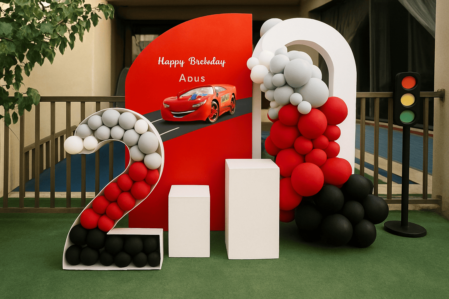 تجهيز حفلة عيد ميلاد بطابع السيارات مثالي لحفلات الأطفال، مع بالونات حمراء وخلفية سباق وأرقام مميزة لمنح الحفل أجواء ممتعة. ديكور عيد ميلاد رائع للتصوير ويضيف لمسة احتفالية جميلة لحفلات الأطفال.تجهيز حفلة عيد ميلاد بطابع السيارات مثالي لحفلات الأطفال، مع بالونات حمراء وخلفية سباق وأرقام مميزة لمنح الحفل أجواء ممتعة. ديكور عيد ميلاد رائع للتصوير ويضيف لمسة احتفالية جميلة لحفلات الأطفال.