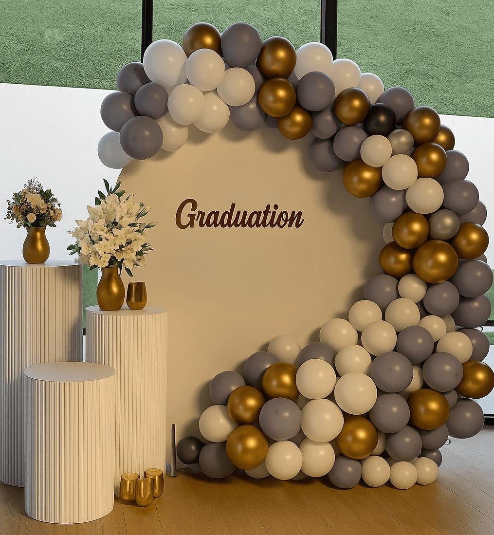 ديكور تخرج راقٍ يتميز بقوس بالونات عصري بألوان محايدة مع الأبيض والرمادي والذهبي، مع طاولات عرض أنيقة وتنسيق زهور ناعم. مثالي لحفلات التخرج واحتفالات الإنجاز، ويوفر خلفية تصوير أنيقة وأجواء تخرج لا تُنسى.ديكور تخرج راقٍ يتميز بقوس بالونات عصري بألوان محايدة مع الأبيض والرمادي والذهبي، مع طاولات عرض أنيقة وتنسيق زهور ناعم. مثالي لحفلات التخرج واحتفالات الإنجاز، ويوفر خلفية تصوير أنيقة وأجواء تخرج لا تُنسى.