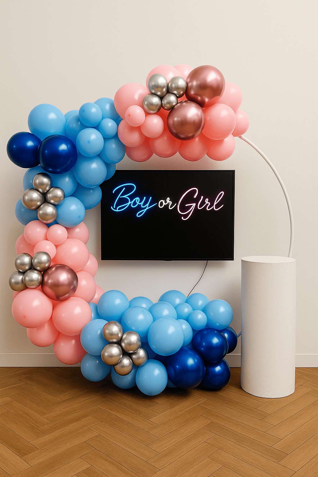 ديكور عصري لحفلة الكشف عن المولود مع بالونات معدنية ولافتة نيون مضيئة. مثالي لحفلات بيبي شو أو كشف المولود بأسلوب حديث ولمسات فاخرة مفعمة بالحيوية.