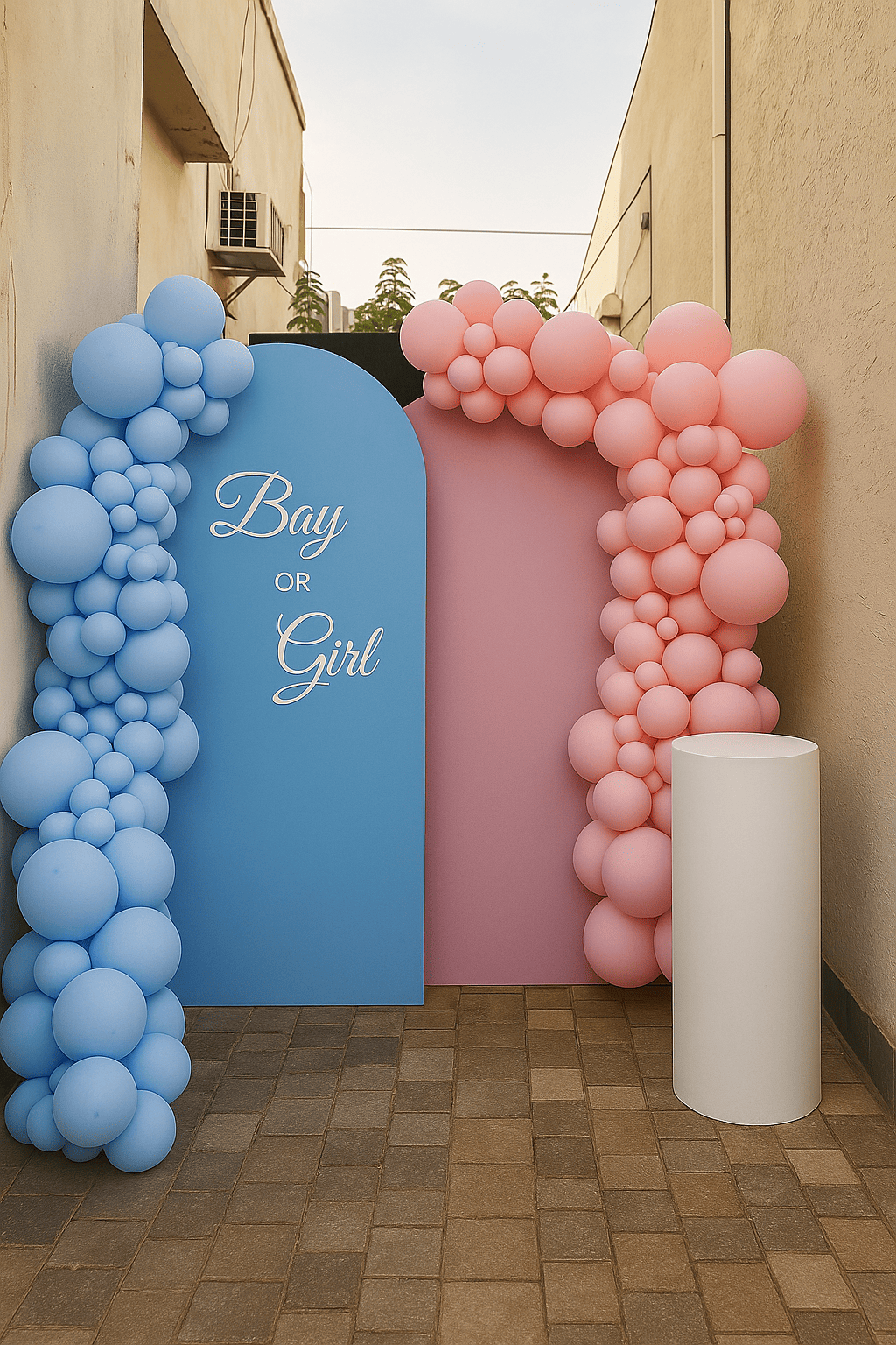 تصميم راقٍ لحفلة الكشف عن المولود بألوان زرقاء ووردية ناعمة على خلفيتين مقوستين. مثالي لحفلات البيبي شو أو حفلات الكشف عن المولود بأسلوب بسيط وعصري.