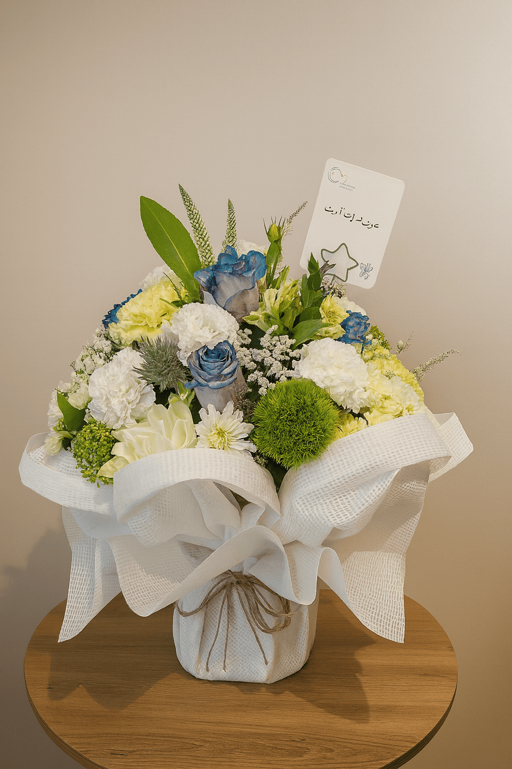 باقة منعشة من الورد الجوري الأزرق مع أزهار بيضاء وصفراء، تجسد التميز والأناقة بروح عصرية