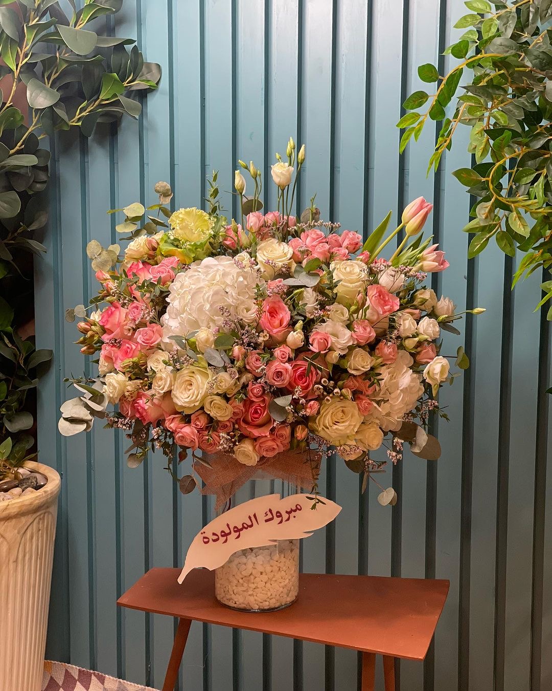 تنسيق ورد كبير بألوان وردية وبيضاء هادئة، يضم توليب وهيدرنجا وورد مشكل في قاعدة شفافة مع بطاقة تهنئة بالمولود