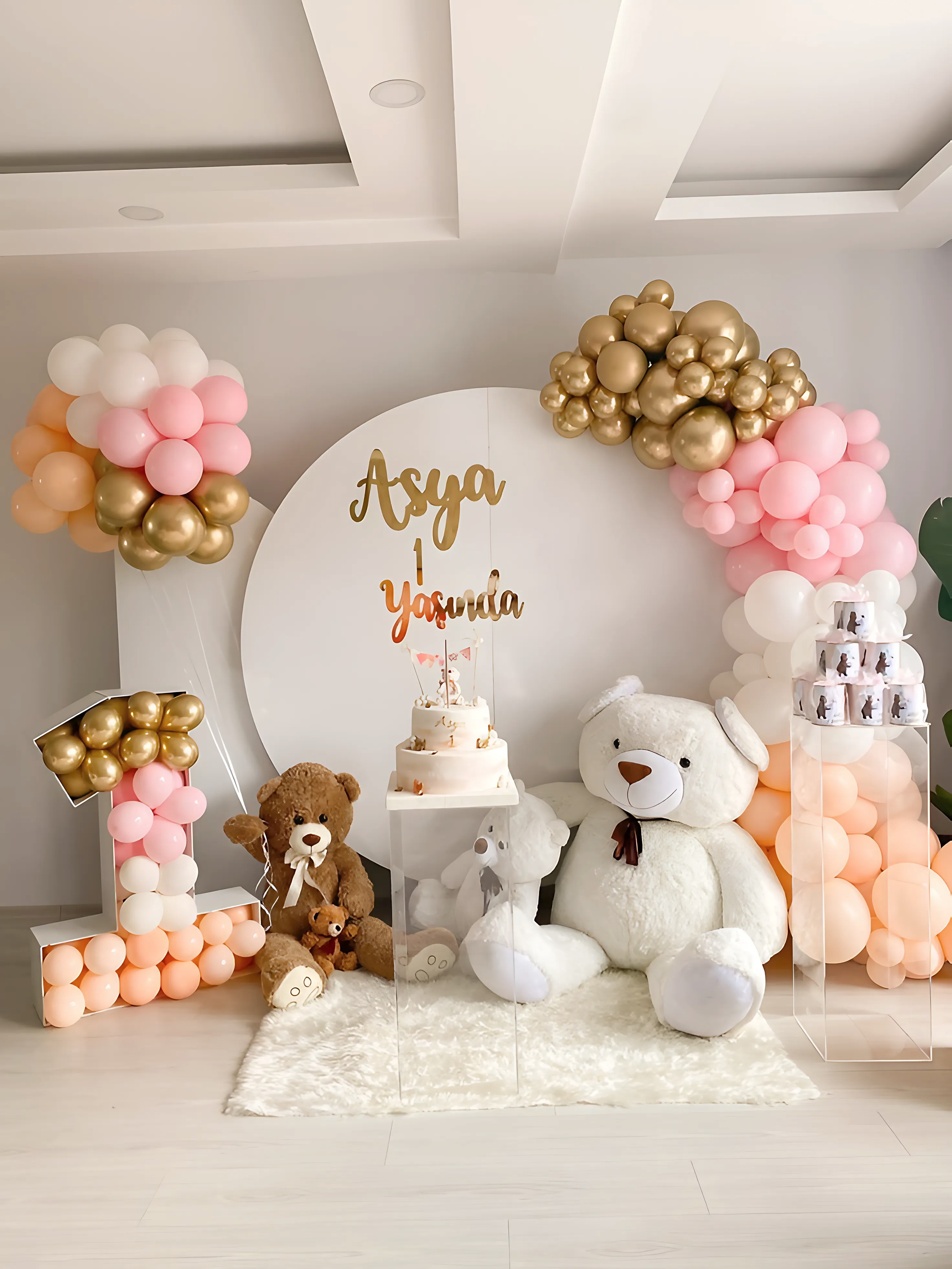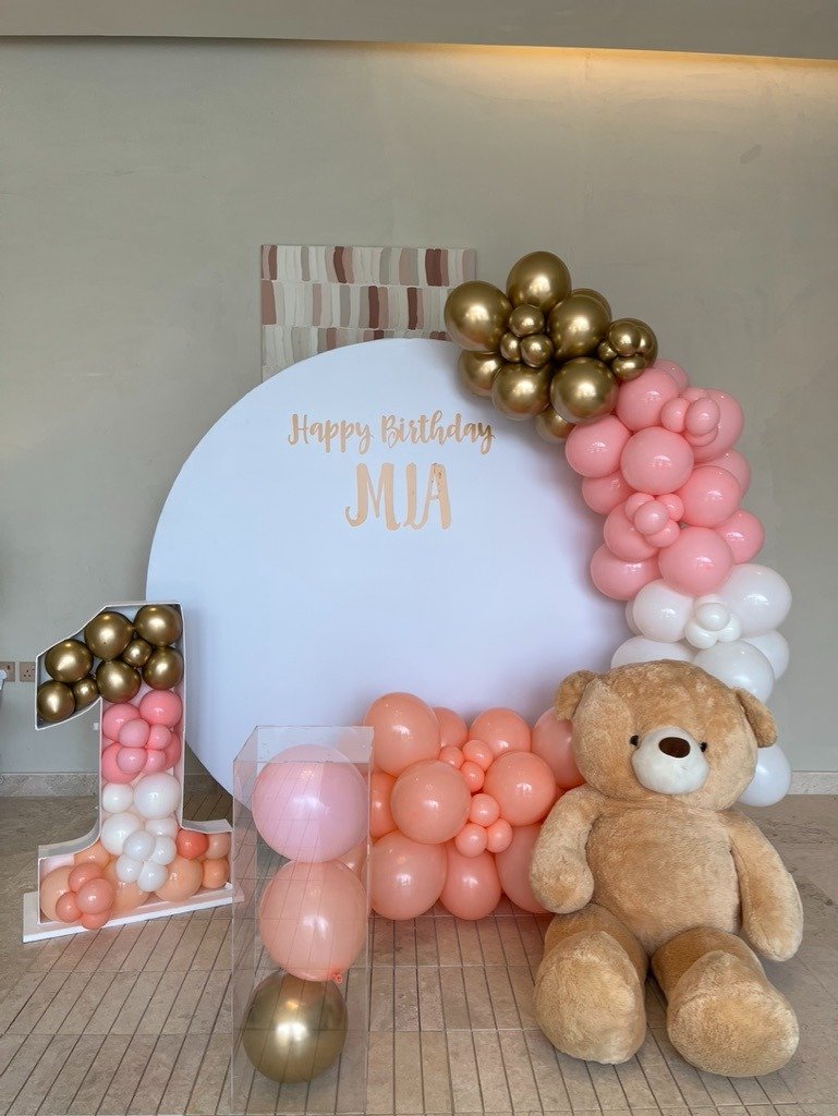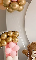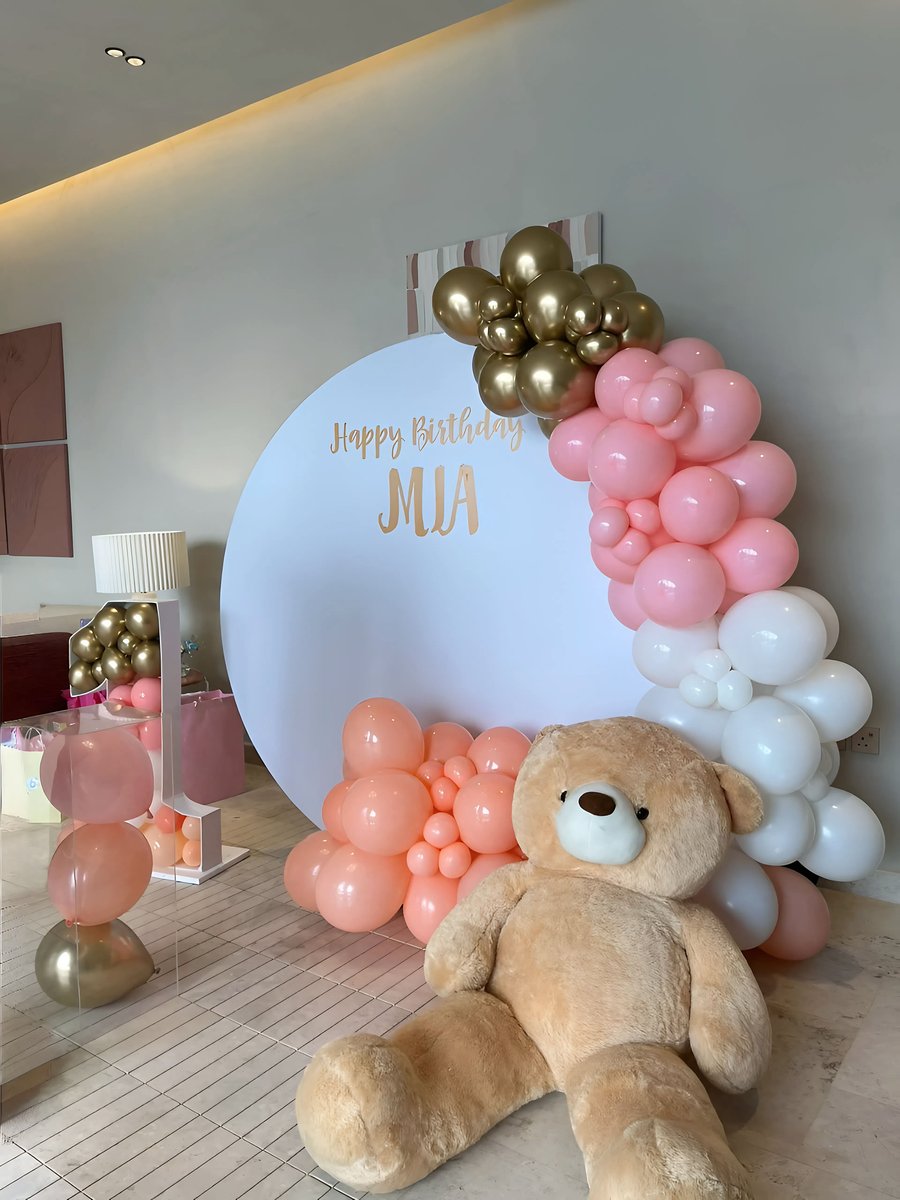 زينة حفلة ميلاد للأطفال بتصميم دافئ مستوحى من الدببة مع بالونات وردية وذهبية ولمسات ناعمة. تنسيق مثالي لأي حفلة عيد ميلاد ويضيف جمالًا خاصًا لديكور الاحتفال ويمنح أجواء مليئة بالمرح للأطفال.زينة حفلة ميلاد للأطفال بتصميم دافئ مستوحى من الدببة مع بالونات وردية وذهبية ولمسات ناعمة. تنسيق مثالي لأي حفلة عيد ميلاد ويضيف جمالًا خاصًا لديكور الاحتفال ويمنح أجواء مليئة بالمرح للأطفال.