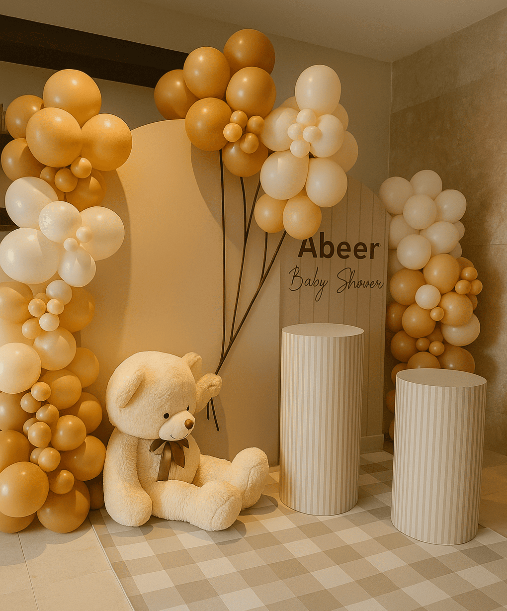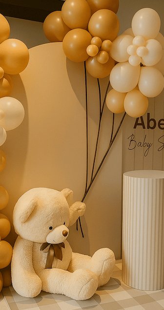 ثيم الدبدوب البيج الراقي مثالي لحفلات البيبي شاور واستقبال المواليد. تصميم أنيق بألوان البيج والكريمي مع دبدوب لطيف يضيف جو دافئ ولمسة فخمة للمكان. مناسب للاحتفالات في البيت أو المستشفى بأجواء راقية ومليانة حب.ثيم الدبدوب البيج الراقي مثالي لحفلات البيبي شاور واستقبال المواليد. تصميم أنيق بألوان البيج والكريمي مع دبدوب لطيف يضيف جو دافئ ولمسة فخمة للمكان. مناسب للاحتفالات في البيت أو المستشفى بأجواء راقية ومليانة حب.