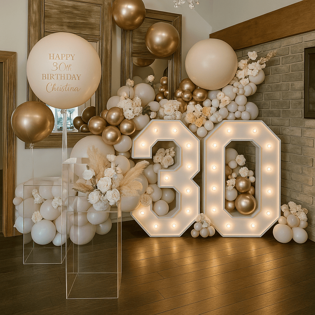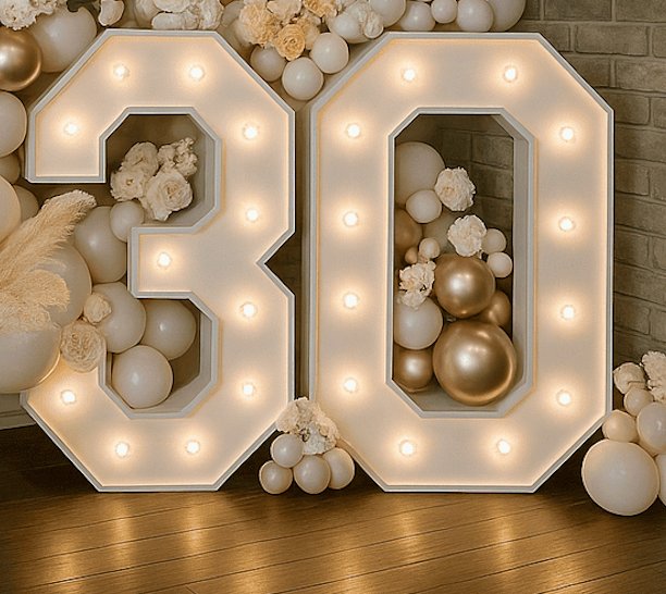 تنسيق فاخر باللونين الأبيض والذهبي لاحتفال بيوم الميلاد، مزين بأرقام مضيئة وزهور أنيقة. تصميم عصري وفخم يعكس الأناقة والرقي في كل تفصيل لمناسبة لا تُنسى.تنسيق فاخر باللونين الأبيض والذهبي لاحتفال بيوم الميلاد، مزين بأرقام مضيئة وزهور أنيقة. تصميم عصري وفخم يعكس الأناقة والرقي في كل تفصيل لمناسبة لا تُنسى.
