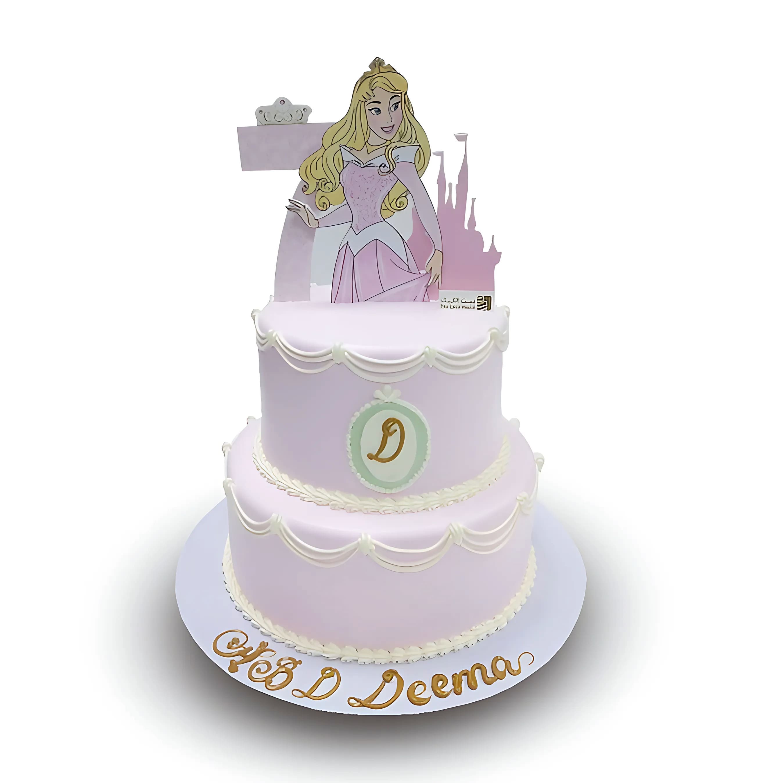 كيكة من طبقتين باللون الوردي الفاتح، بتصميم أنيق مستوحى من الأميرة النائمة مزينة بتاج وقصر الأميرات، وحرف ذهبي في المنتصف، مع عبارة “Happy Birthday” مكتوبة على القاعدة تكفي لعدد ٣٥ شخص
