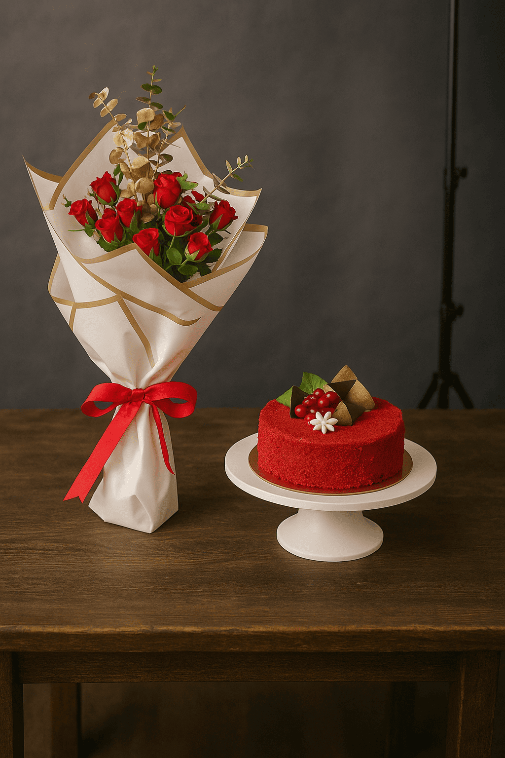 - 12 وردة سبراي حمراء ملفوفة ومربوطة بشكل جميل - كيكة رد فلفت الوزن: نصف كجم