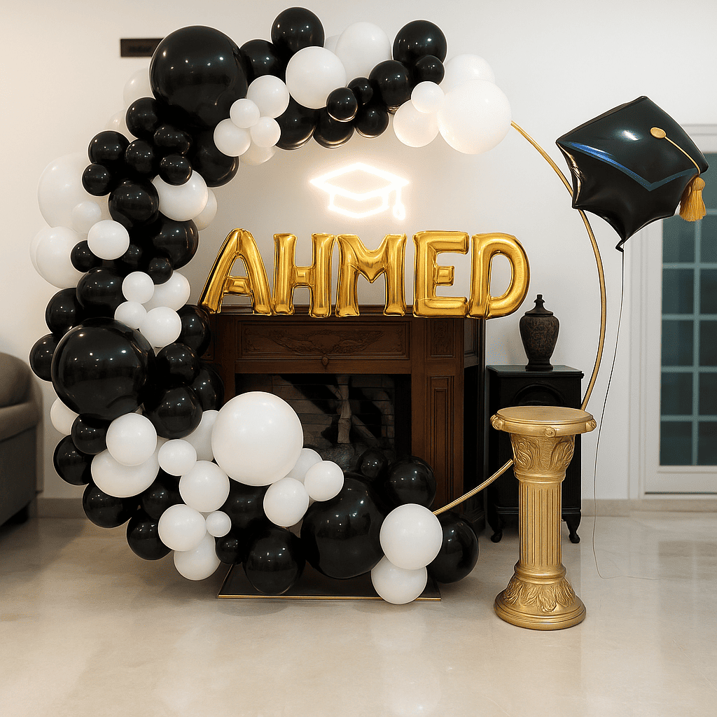 قوس بالونات أنيق مصمم لإبراز احتفالات التخرج بأسلوب عصري وألوان فاخرة. يمكن تنسيقه أيضًا ليكون مناسبًا لحفلات عيد الميلاد، ديكور عيد ميلاد راقٍ، أعياد ميلاد الأطفال، وتنظيم أجواء احتفال مميزة للمناسبات الخاصة والاحتفالات الداخلية.