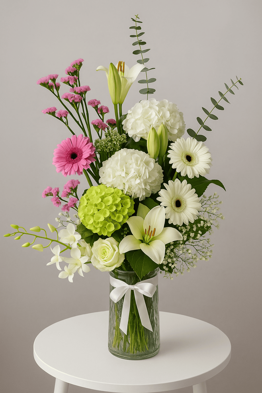 فازة ورود طبيعية ذات ألوان هادئة، مثالية كهدية للتهنئة والمناسبات يتوفر كتابة كرت باللغة العربية والإنجليزية، الرجاء كتابة المطلوب طباعته في الملاحظات كرت "قيفت بازار"مجانًا مع كل طلب