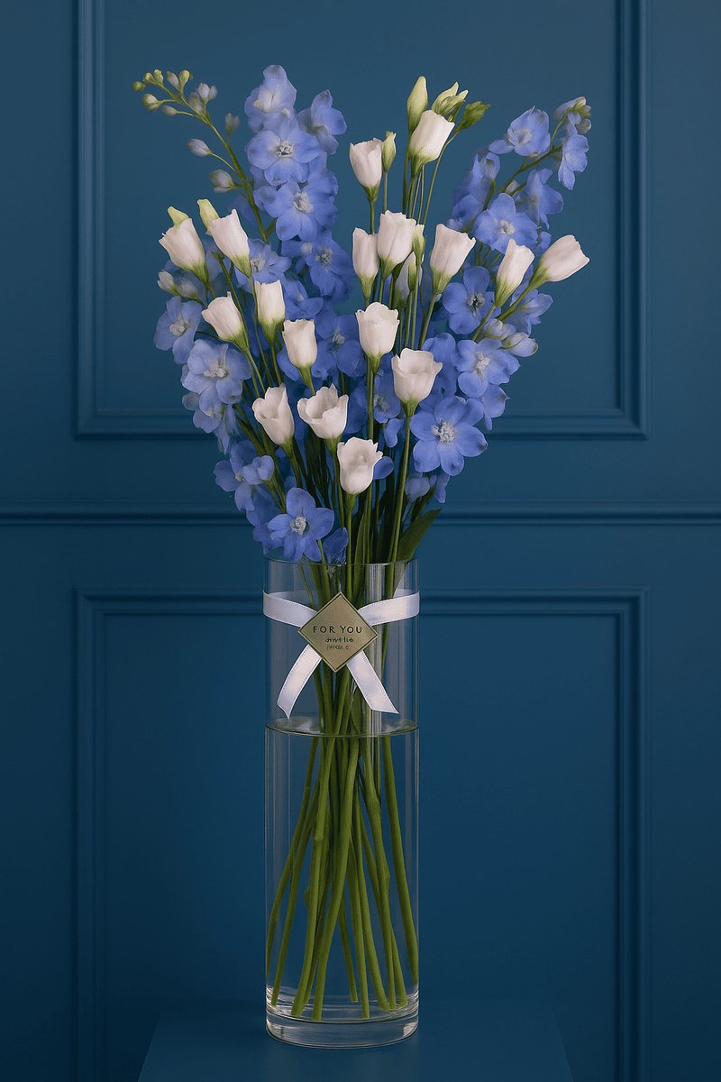 فازة الدلفينيوم بلونها الجذاب تجسد أناقة وجمال الطبيعة بلمسة عصرية ، تحتوي علي الدلفينيوم والاستوما .