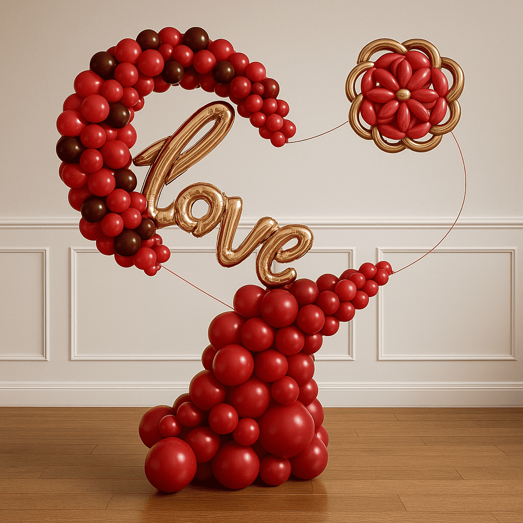 مجسّم بالونات فاخر باللونين الأحمر والذهبي مع كلمة "Love" وزهرة بالونية أنيقة. مثالي لذكرى الزواج، عروض الخطوبة والمفاجآت الرومانسية. تصميم راقٍ يضيف لمسة دافئة ومعبّرة لأي مناسبة خاصة.