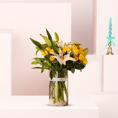 فازة مكونه من ٥ كازابلنكا أبيض، ١٠بيبي روز أصفر ، ٤ سوليداغو.
