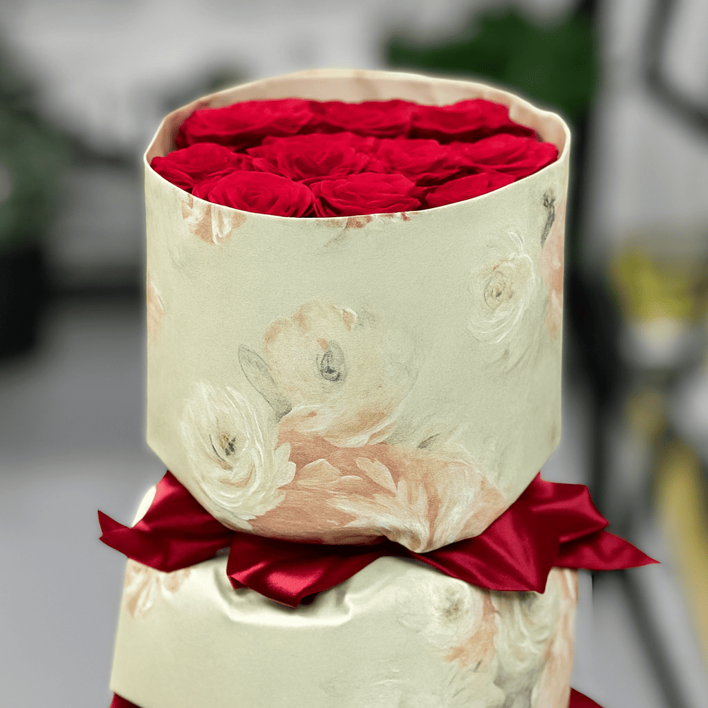 باقة فاخرة من الورود، منسقة بأناقة داخل تغليف مزخرف بنقوش وردية فنية، ومزينة بشريط ساتان أحمر.