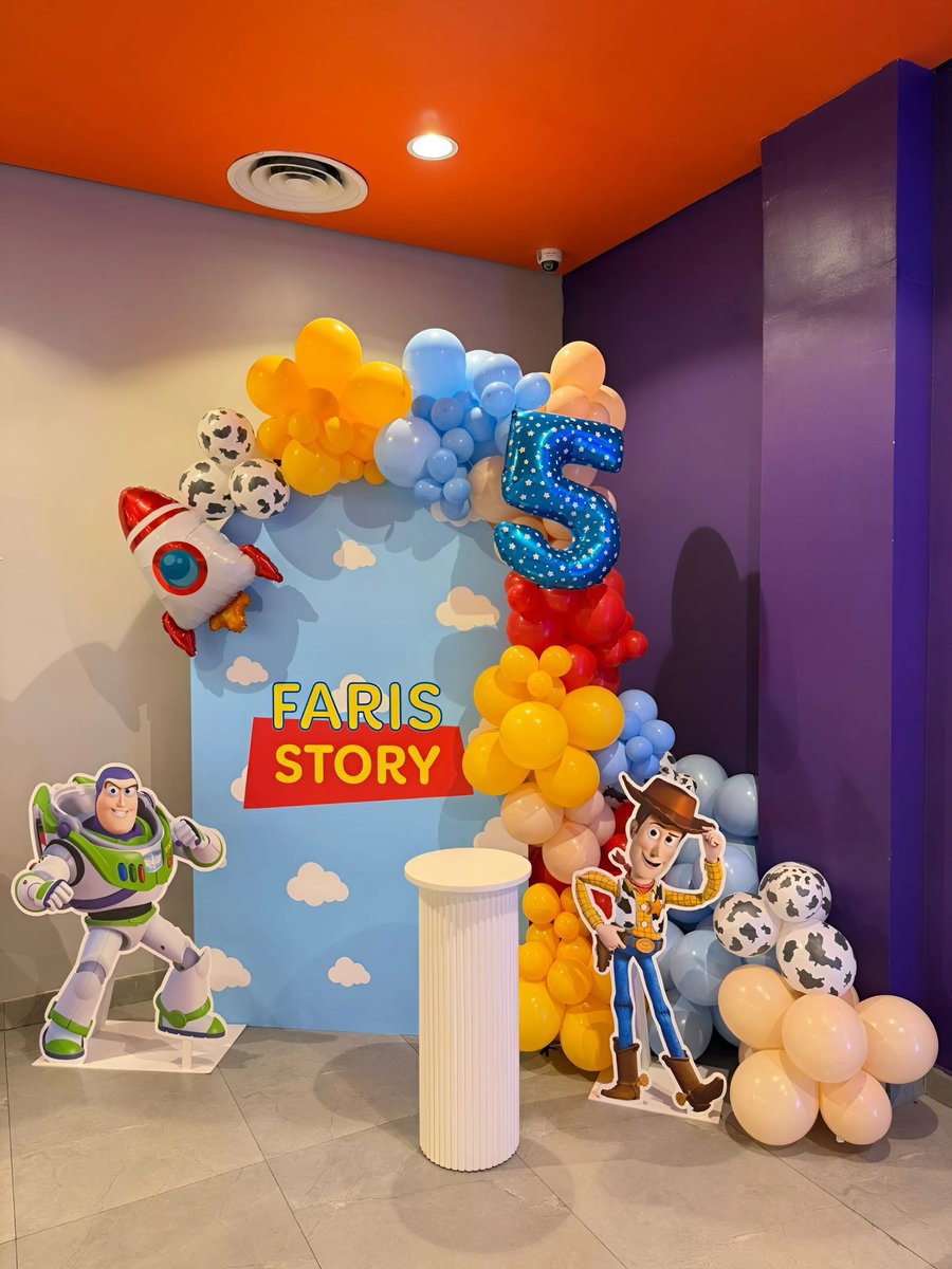 تنسيق عيد ميلاد مستوحى من شخصيات Toy Story مع بالونات ملونة، مجسمات كرتونية، وخلفية مخصصة برقم. مثالي لحفلات أعياد ميلاد الأطفال والاحتفالات المرحة داخل القاعات.