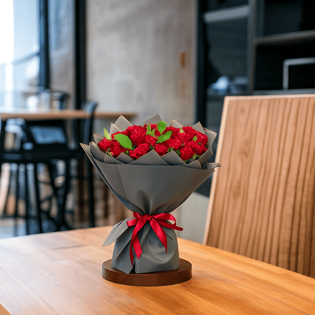 باقة أنيقة من الزهور الحمراء ملفوفة بتنسيق فاخر ترمز للشغف والرقي.