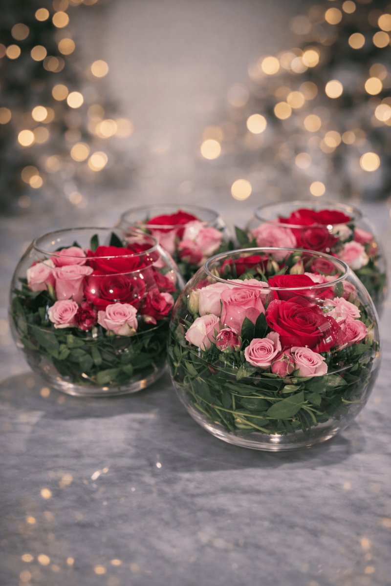 تنسيق وردي راقٍ يجمع بين الورود الحمراء والوردية داخل فازات زجاج أنيقة يعكس دفء المشاعر وجمال التفاصيل اختيار مثالي لإضفاء لمسة رومانسية ناعمة على أي مناسبة