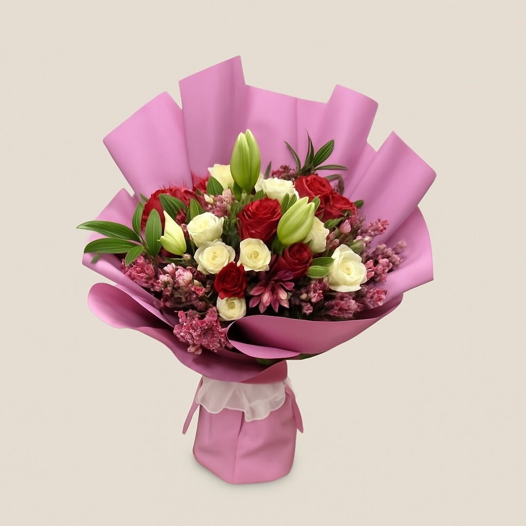تتكون الباقة من ورد جوري سوباتي عدد 10 + ليليوم هولندي عدد 1+كرز هولندي عدد 1 + استوميريا هولندي عدد 1