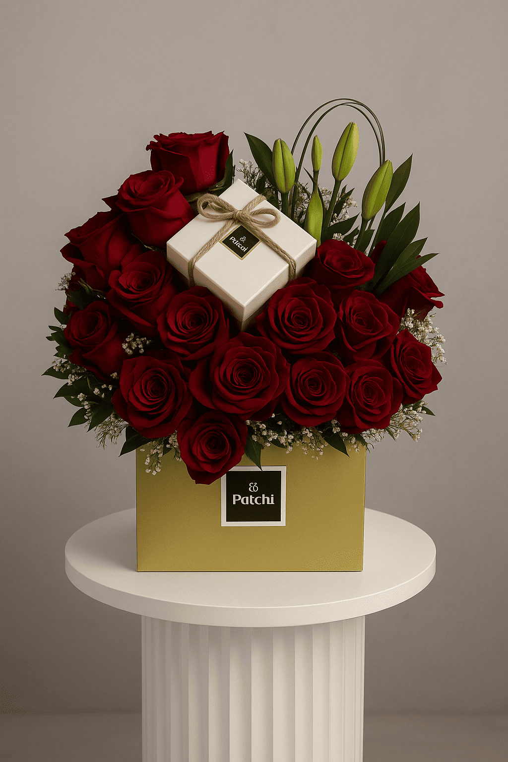 بكج ورود طبيعية ذات ألوان هادئة مع شوكليت باتشي ، مثالية كهدية للتهنئة والمناسبات يتوفر كتابة كرت باللغة العربية والإنجليزية، الرجاء كتابة المطلوب طباعته في الملاحظات