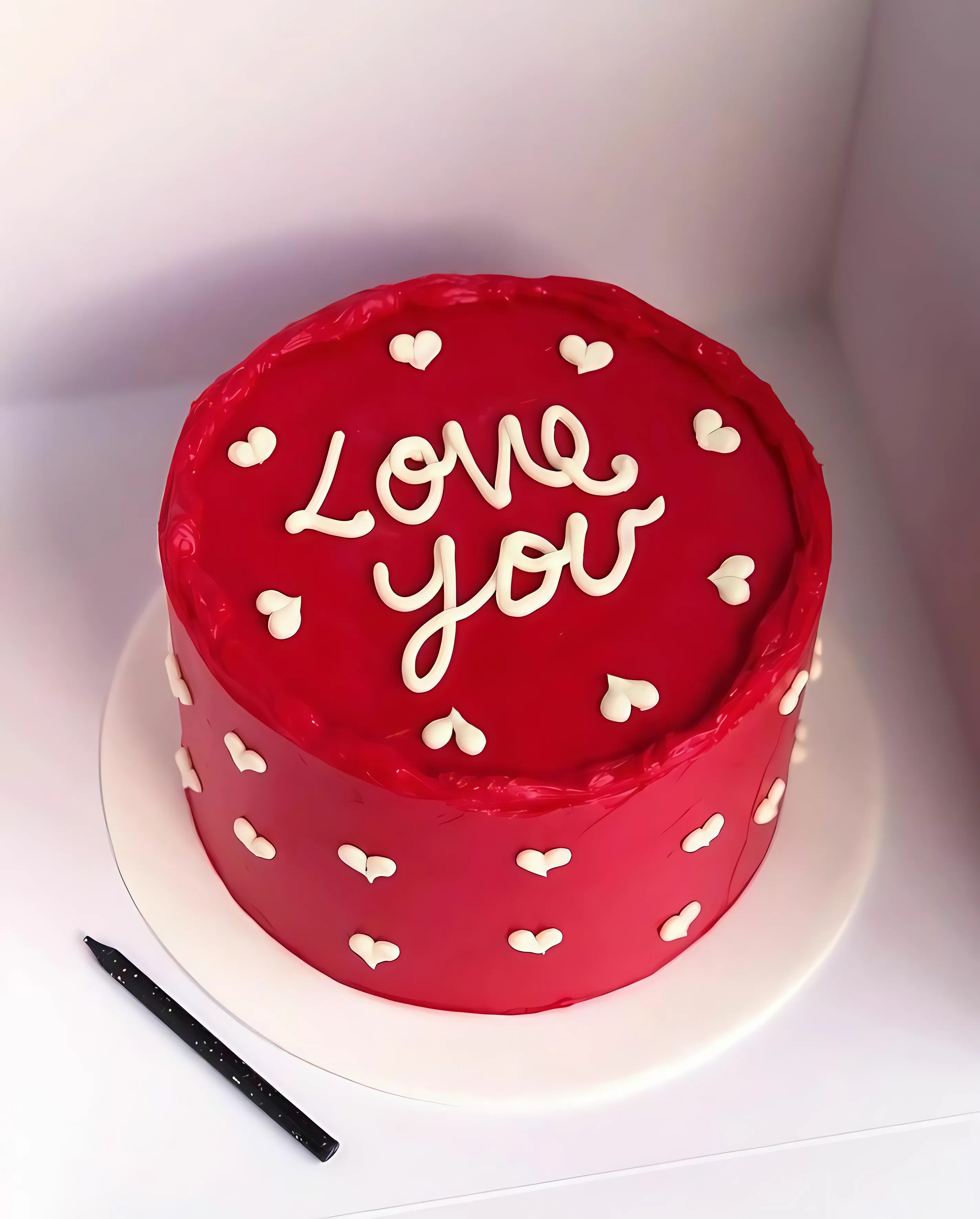 كيكة حمراء ناعمة مزينة بقلوب بيضاء وكلمة "Love You"، تعبير بسيط ومميز عن الحب والمشاعر