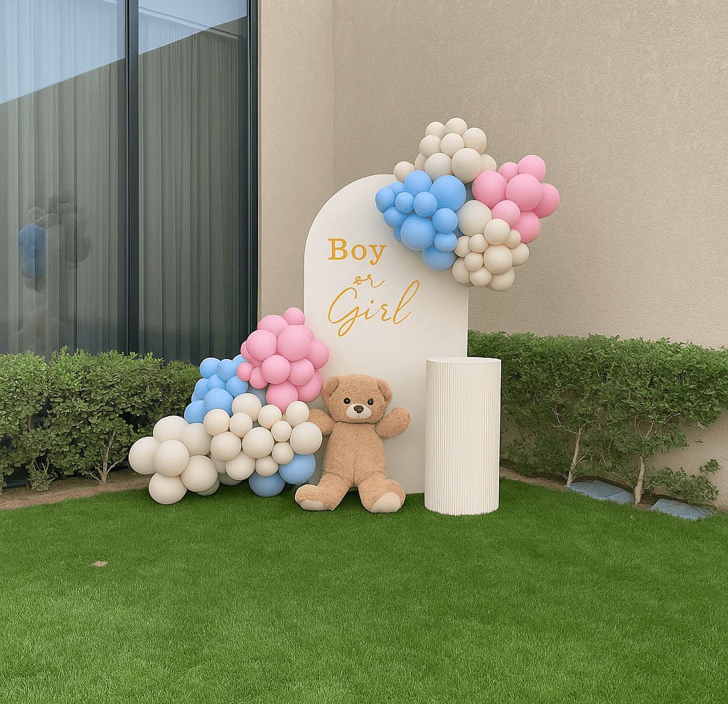 تصميم ناعم لحفلة الكشف عن المولود بديكور تيدي بير وبالونات بألوان البيج والوردي والأزرق. مثالي لحفلات الكشف أو البيبي شو الخارجية بأسلوب بسيط ودافئ.تصميم ناعم لحفلة الكشف عن المولود بديكور تيدي بير وبالونات بألوان البيج والوردي والأزرق. مثالي لحفلات الكشف أو البيبي شو الخارجية بأسلوب بسيط ودافئ.