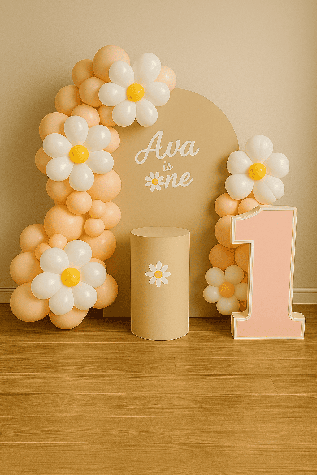 تنسـيق عيد ميلاد بنمط زهور الديزي مع بالونات خوخية وورود بيضاء وخلفية بألوان ناعمة. مثالي لخلق أجواء لطيفة وأنيقة للاحتفال بعيد ميلاد طفلتك الأول بطريقة مميزة.تنسـيق عيد ميلاد بنمط زهور الديزي مع بالونات خوخية وورود بيضاء وخلفية بألوان ناعمة. مثالي لخلق أجواء لطيفة وأنيقة للاحتفال بعيد ميلاد طفلتك الأول بطريقة مميزة.