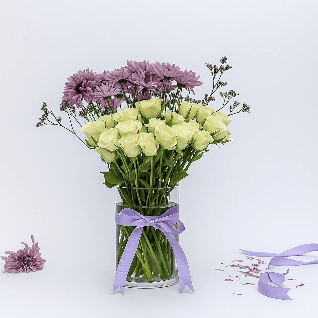 فازة زجاجية مع بيبي جوري سكري وزهرة الكريس البنفسجي