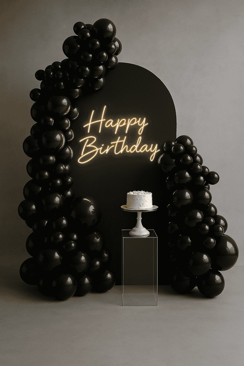 ديكور عيد ميلاد أنيق باللون الأسود مع لافتة مضيئة وخلفية بالونات، مناسب لحفلات عيد الميلاد الفاخرة والاحتفالات العصرية وأعياد الكبار بتصميم راقٍ ومميز.