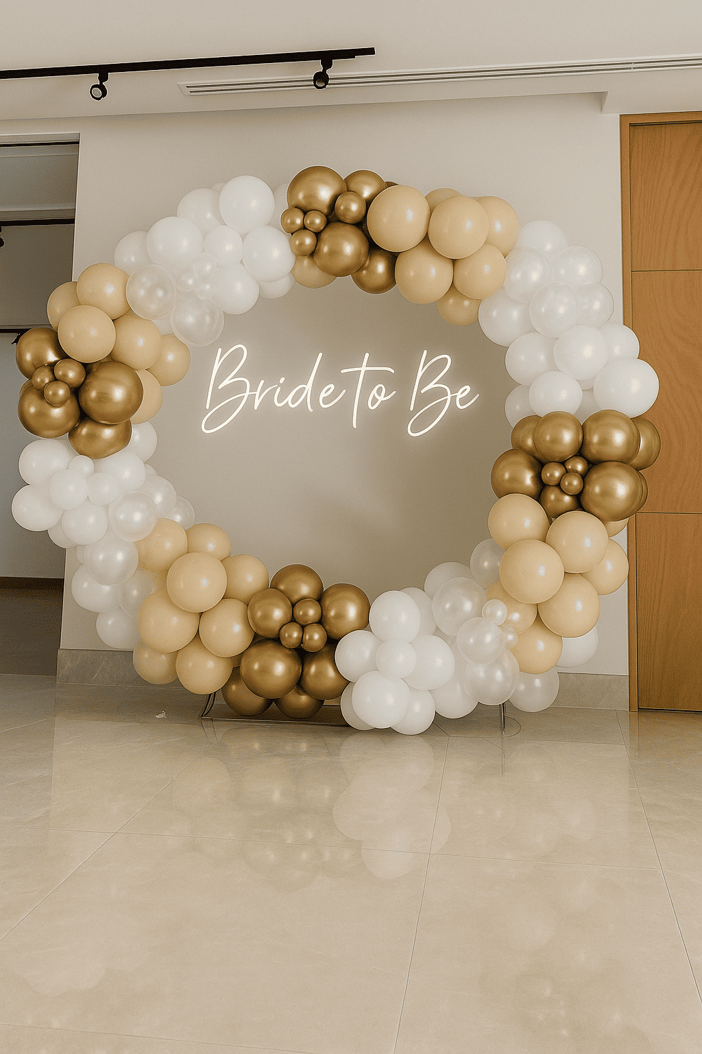 ديكور دائرة العروس الكلاسيكية بألوان ذهبي وأبيض فخم، مثالي لحفلات التوديع أو الخطوبة أو جلسات التصوير. تصميم أنيق يضيف لمسة فخامة ولمعان لأي احتفال ويجعل المناسبة مليئة بالفرح والرقي.