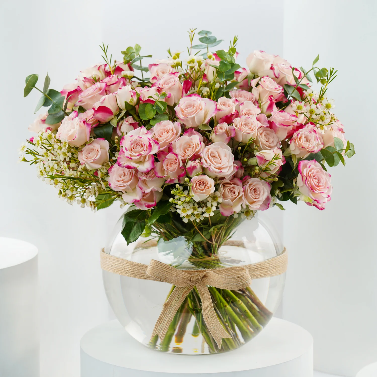 - 20 وردة سبري روز زهرية مع تظليل مزدوج - 2 ساق شمع أبيض - 1 أوكالبتوس - شريط جوت